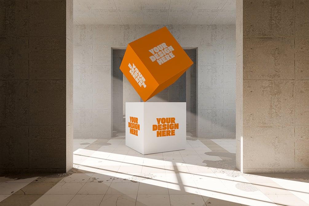 Set against a clean, minimal, and architectural backdrop, the cube format adds credibility and refinement to your typography presentation. The natural light and shadows provide depth, ensuring that text remains the hero element of the scene.